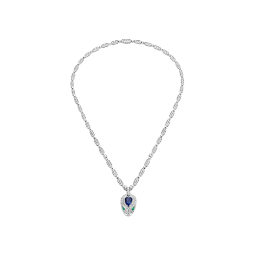 Serpenti 18 kt white gold necklace set with a blue sapphire on the head, emerald eyes and pavé diamonds